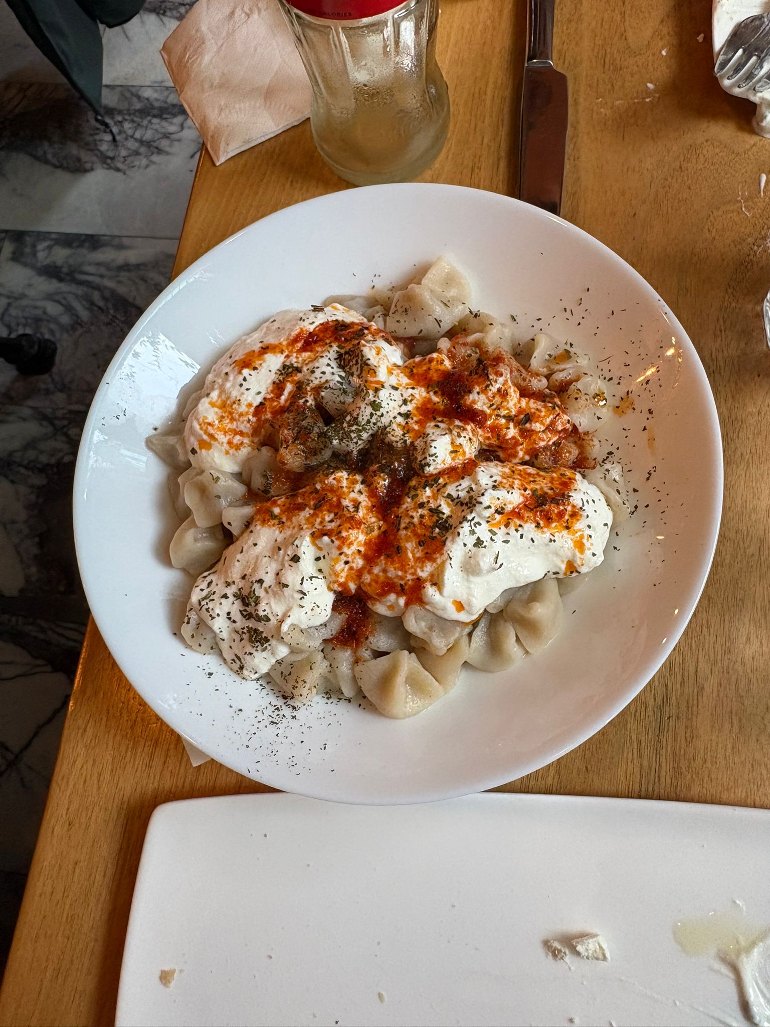 De Turkse ravioli (manti) is een vreemd gerecht voor wie het niet kent: veel kleine kussentjes pasta onder een laag yoghurt. Het is even schakelen, maar het werkt — vooral als je op dat moment trek hebt in comfort rather than verfijning.
