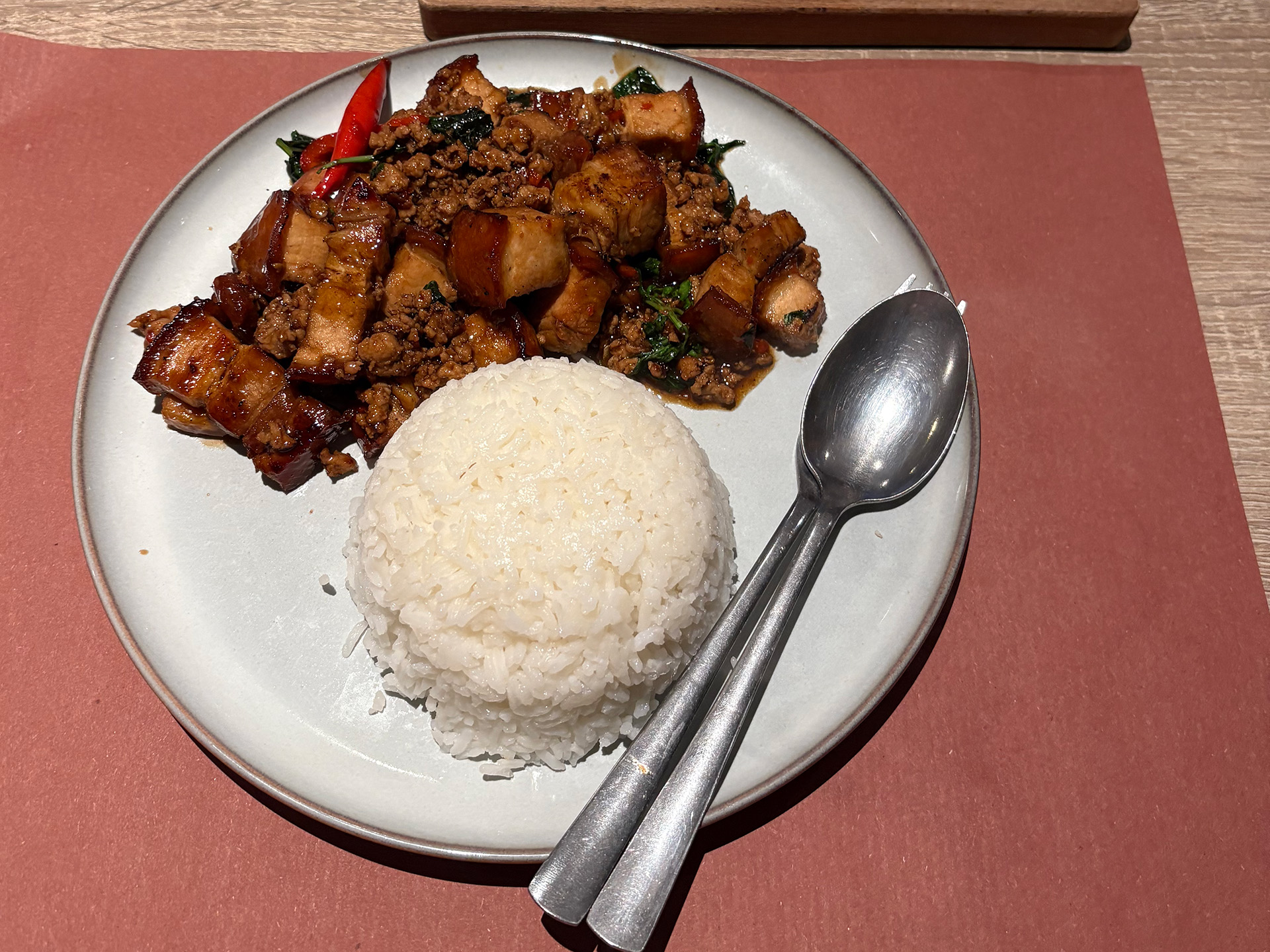 De smaken doen waar je op hoopt: krachtig, vol en duidelijk Thais. Een gerecht met varkensvlees, spiegelei en spinazie bleek een onverwachte hit — rijk, hartig en net even anders dan de standaard.