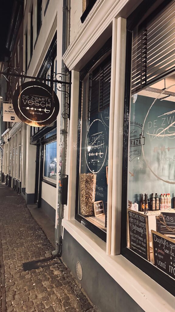 Bij binnenkomst door de rode gordijntjes omarmt de warmte je direct. Het interieur is klassiek, bruin en romantisch, met een leestafel vol kranten waar je de tijd kunt vergeten. Een waanzinnig detail dat Jelle spotte: naast de voordeur zit een gat in de muur met een glijbaan. Waarom? Om de kratten bier en fris rechtstreeks de elfde-eeuwse werfkelder in te lanceren.