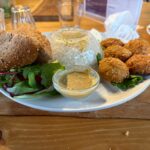 Aanrader: de sharing plate, een enorme schaal met allerlei verschillende en spannende gerechten. Je begint met een linzensoep die standaard met wat citroen wordt geserveerd – verrassend fris en totaal anders dan je gewend bent. De tameya, Soedanese falafel, is verrukkelijk: knapperig van buiten, smaakvol van binnen, met verse dille en een pittige groene chilisaus. Ook de abugassi – kip met paprika, knoflook en pindasaus – is heerlijk smeuïg. Let wel op de bamya, een stoofgerecht van okra. De slijmerige textuur bleek bij ons wat verdeeld ontvangen.