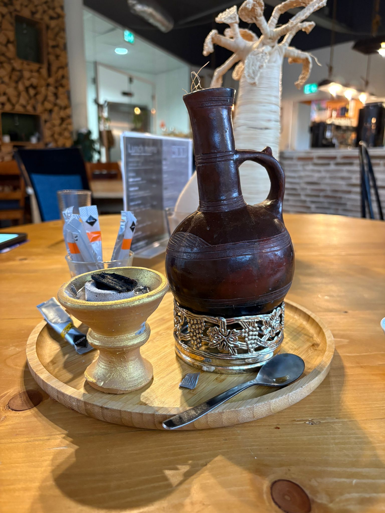 De bediening is buitengewoon vriendelijk, maar de uitvoering wat rommelig. De communicatie is soms lastig – zelfs in het Engels – wat ertoe leidde dat er een bord met mayonaise, friet en kipnuggets verscheen in plaats van het bestelde broodje gezond voor de dochter. Ook werden we wat genegeerd toen we als laatste gasten nog iets wilden bestellen. Het hoogtepunt van de avond is echter de Soedanese koffie. Die wordt geserveerd in een kelk met stro en een wierookachtig geurstaafje voor de traditionele sfeer. De koffie zelf is kruidig, met gember, kruidnagel en kardemom – scherp, intens en opwekkend. Een soort glühwein onder de koffies: eentje waar je echt even van aan gaat.