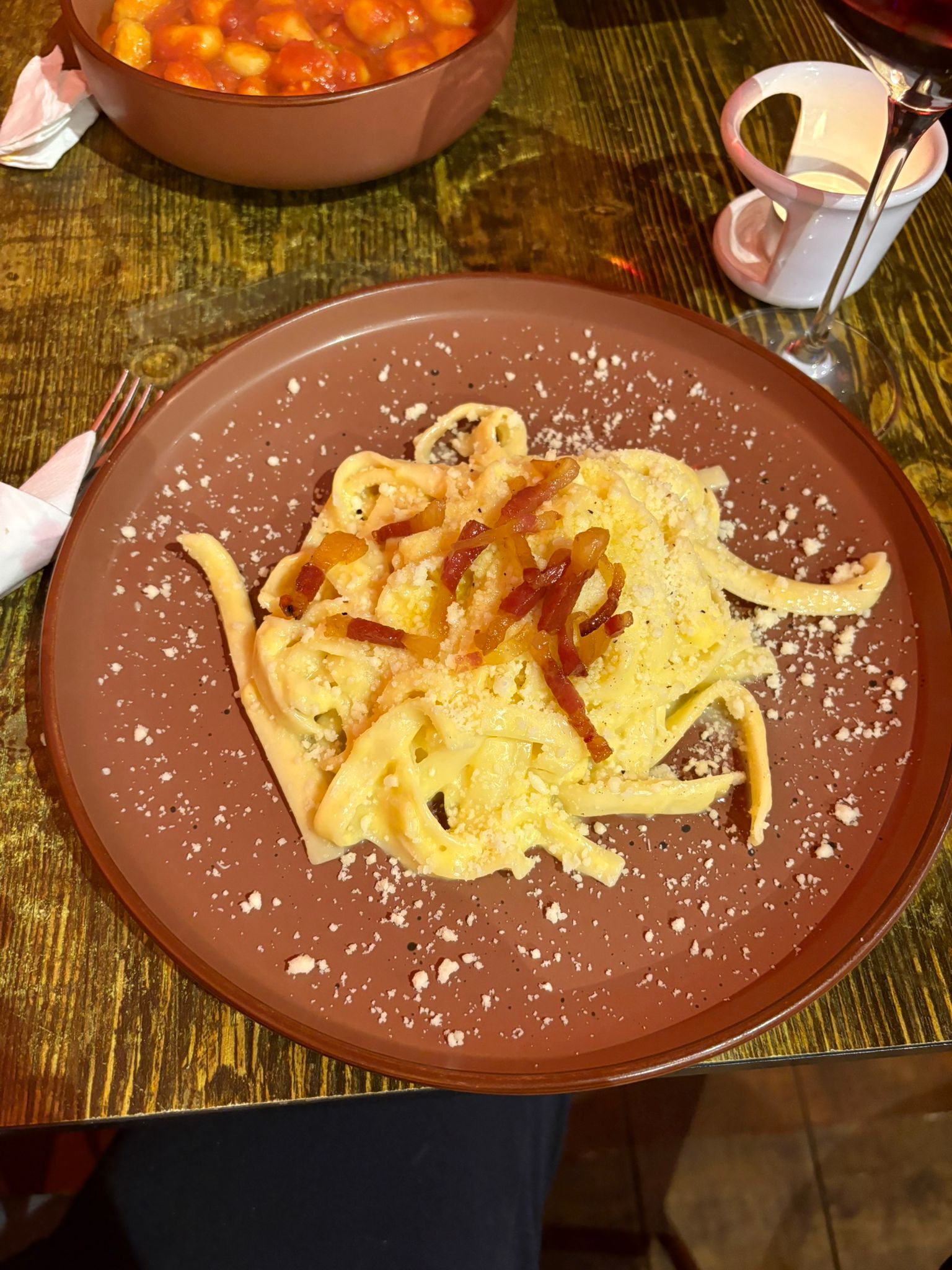 Hier ging het mis. Niet een beetje te zout, maar echt uit balans. Je voelt het meteen in carbonara: zodra één component domineert, valt het geheel om. En dat gebeurde. Wat opviel: het tafeltje naast ons zei het exact hetzelfde, zonder dat we ernaar vroegen. Dat zegt iets.